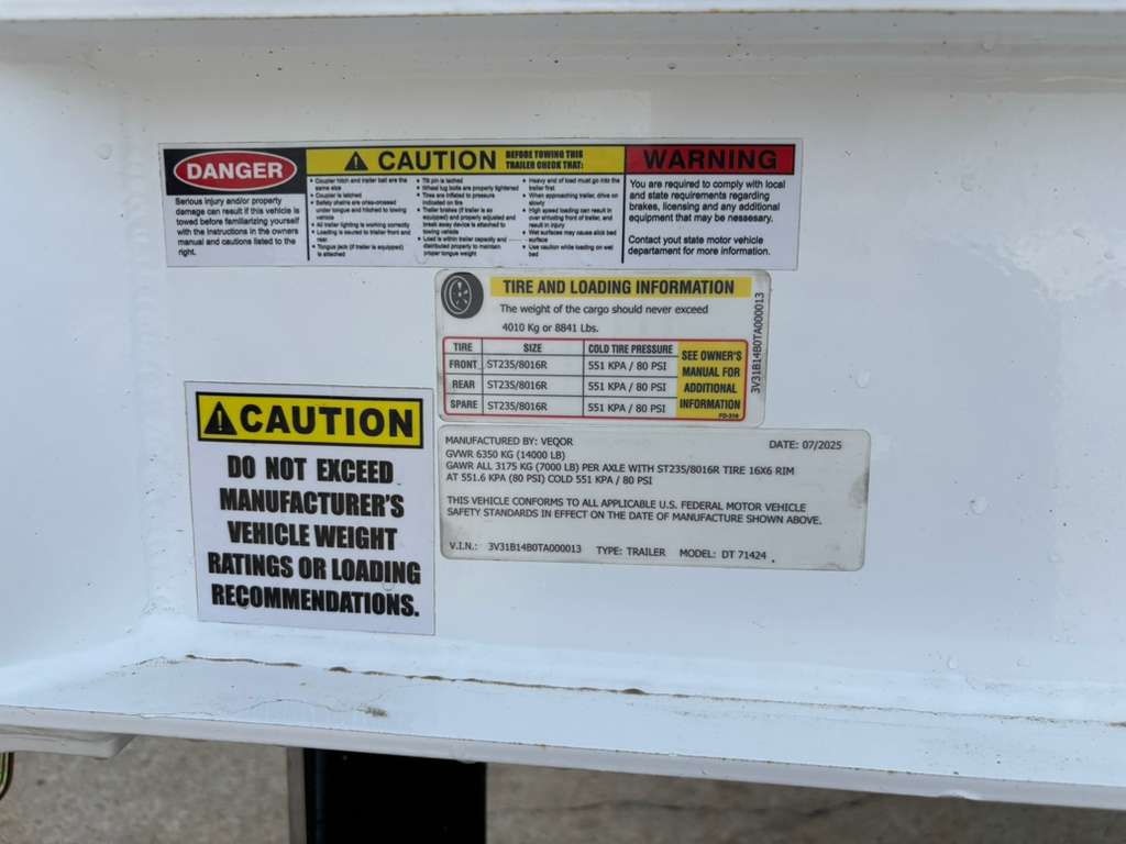 - Manufacturer warranty: Veqor Trailers warranty varies by model/coverage—confirm details at time of sale.